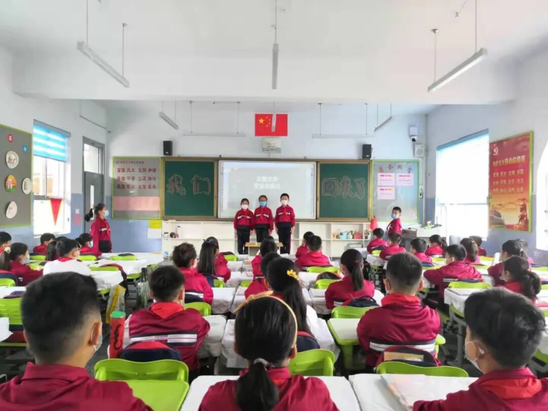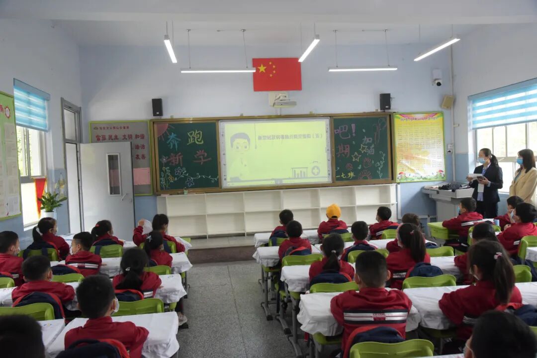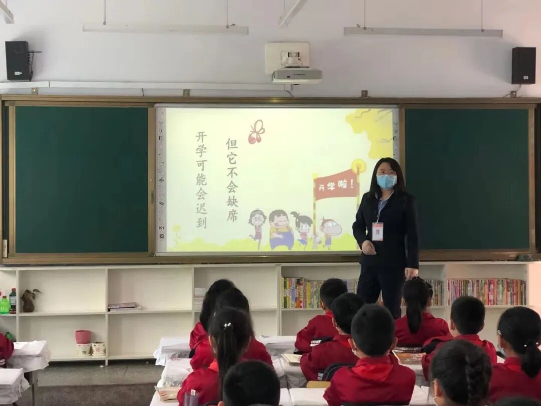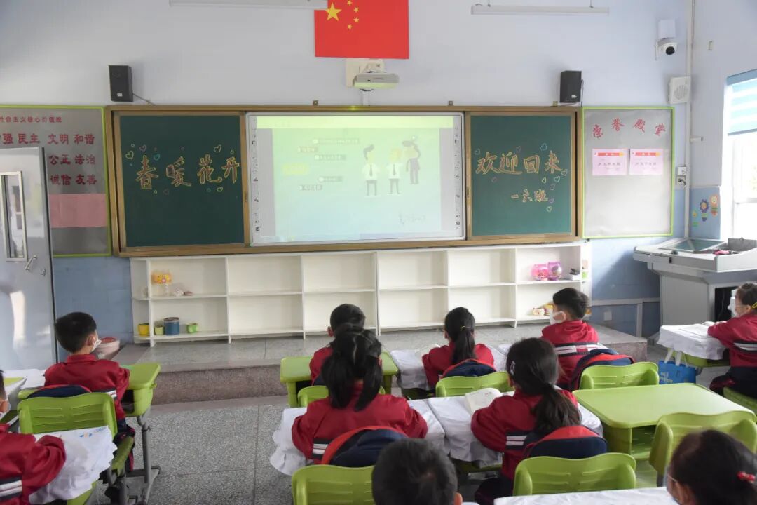 二次测温入班后,班主任利用《复学第一课》专题片,以生动活泼的语言和多彩的画面向大家宣传《教育部中小学校新型冠状病毒肺炎防控指南》和校园防疫知识,巧设问答竞赛提高学生参与积极性,牢记防疫措施,学生们兴趣浓厚,听讲认真。