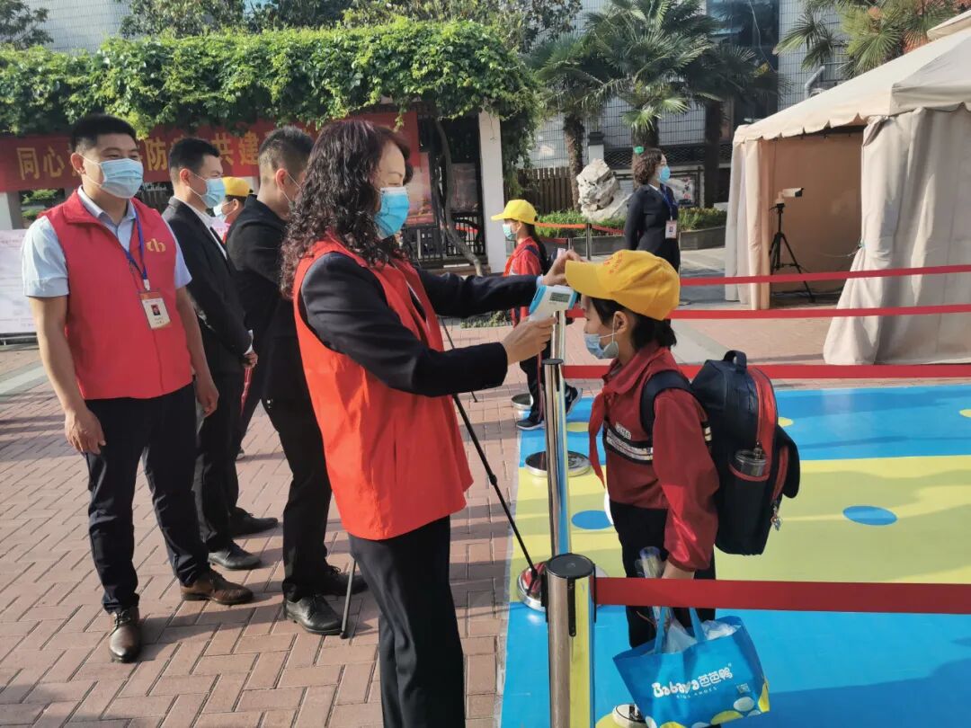 稚气的身影戴着小口罩,背着心爱的书包正一步步朝学校大门走来。学生们在校门口有序排队接受测温,值班人员调低了各项设备,弓下腰来为学生们进行入校消毒,温声嘱咐做好个人防护。