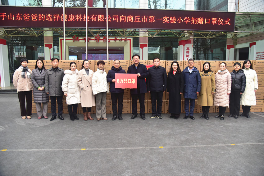 面对新冠肺炎疫情,为了帮助缓解当前学校筹备疫情防控物资压力,商丘市应急管理局携手山东爸爸的选择健康科技有限公司向商丘市第一实验小学捐赠N95口罩6万只,助力学校打赢疫情防控阻击战。商丘市应急管理局党委书记局长李中须、党委委员副局长胡林等班子成员、商丘市第一实验小学校长赫建华及所有领导班子成员参加本次捐赠仪式。